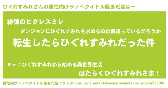 | 女子向けラノベタイトル風あだ名 | 『ひぐれすみれの玉の輿計画!』 |