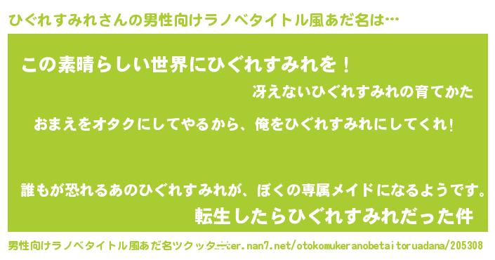 | 女子向けラノベタイトル風あだ名 | 『ひぐれすみれ夫妻のなれそめ』 |