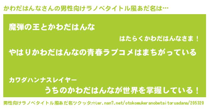 | 女子向けラノベタイトル風あだ名 | 『かわだはんなの雑貨屋さん』 |