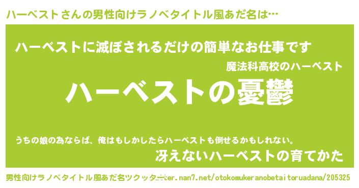 | 女子向けラノベタイトル風あだ名 | 『(仮)ハーベストのやんごとなき事情』 |