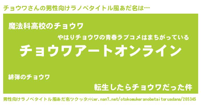 | 女子向けラノベタイトル風あだ名 | 『誰かこのチョウワを説明してください! ~契約から始まるウェディング~』 |