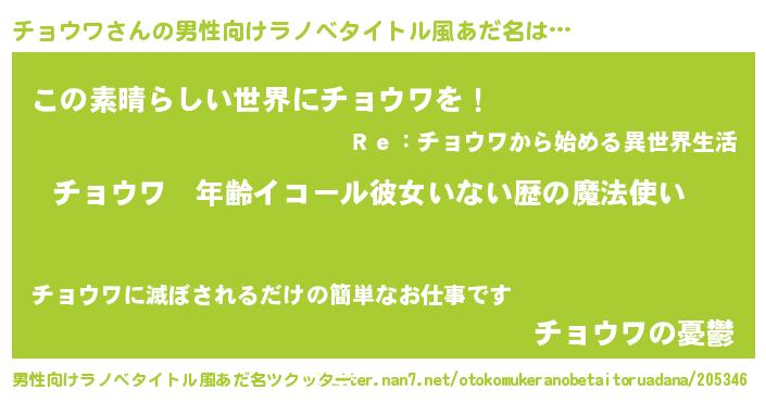 | 女子向けラノベタイトル風あだ名 | 『チョウワの玉の輿計画!』 |