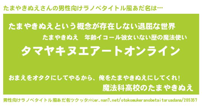 たまやきぬえさんの男性向けラノベタイトル風あだ名をツクッター!