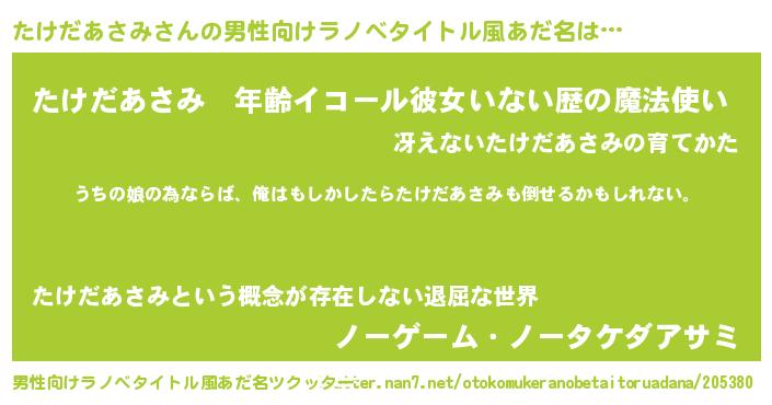 | 女子向けラノベタイトル風あだ名 | 『たけだあさみ伯爵の花嫁』 |