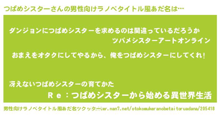 | 女子向けラノベタイトル風あだ名 | 『つばめシスター夫妻のなれそめ』 |