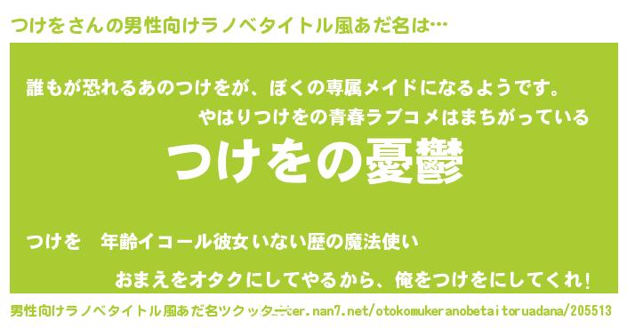 | 女子向けラノベタイトル風あだ名 | 『(仮)つけをのやんごとなき事情』 |