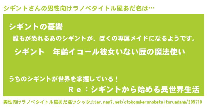 | 女子向けラノベタイトル風あだ名 | 『シギントの玉の輿計画!』 |
