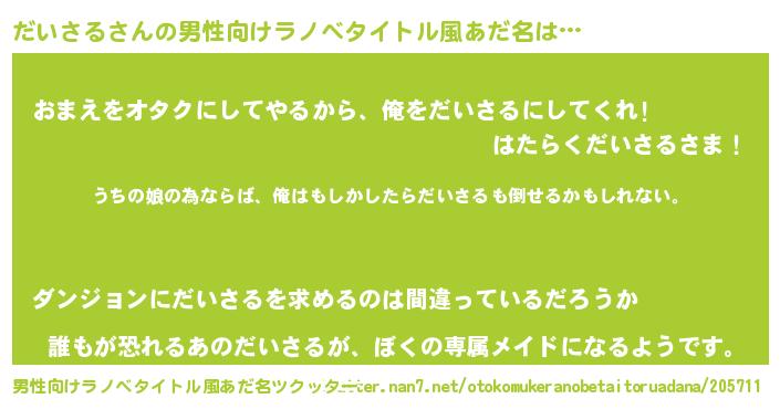 | 女子向けラノベタイトル風あだ名 | 『だいさる伯爵の花嫁』『だいさる恋絵巻』 |