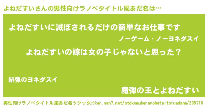 | 女子向けラノベタイトル風あだ名 | 『よねだすいの卵を拾いまして』 |