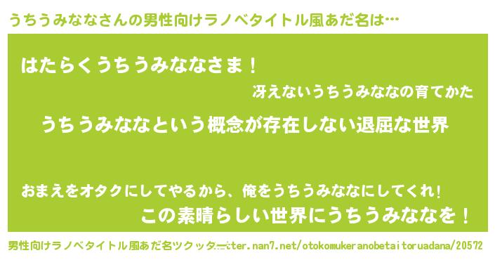 | 女子向けラノベタイトル風あだ名 | 『異世界で失敗しない100のうちうみなな』 |