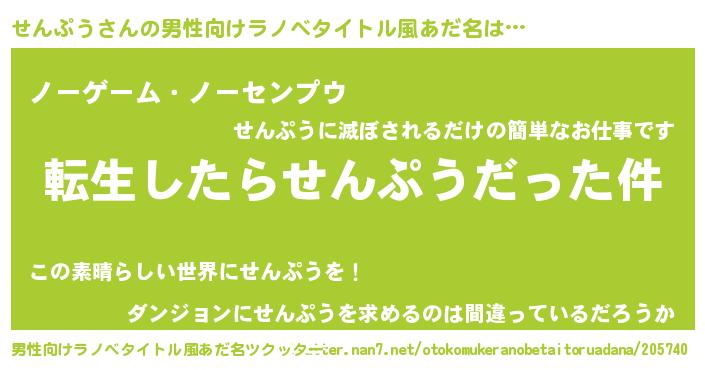 | 女子向けラノベタイトル風あだ名 | 『せんぷうの玉の輿計画!』 |