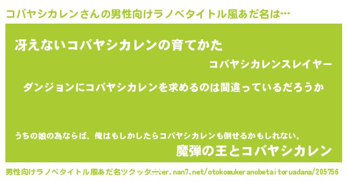 | 胡散臭い通販商品みたいなあだ名 | 『信頼と実績のサプリメント…その名も「コバヤシカレン」』 |