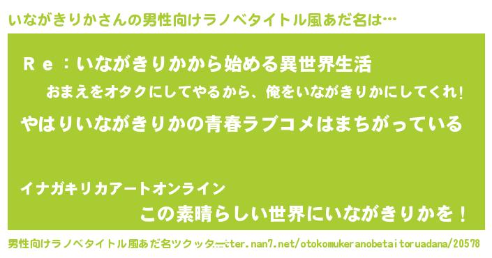 | 女子向けラノベタイトル風あだ名 | 『いながきりかの雑貨屋さん』 |