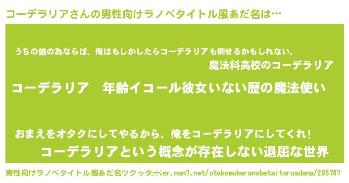 | 女子向けラノベタイトル風あだ名 | 『コーデラリアの玉の輿計画!』 |