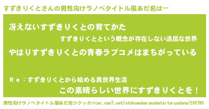 | 女子向けラノベタイトル風あだ名 | 『すずきりくとの雑貨屋さん』 |