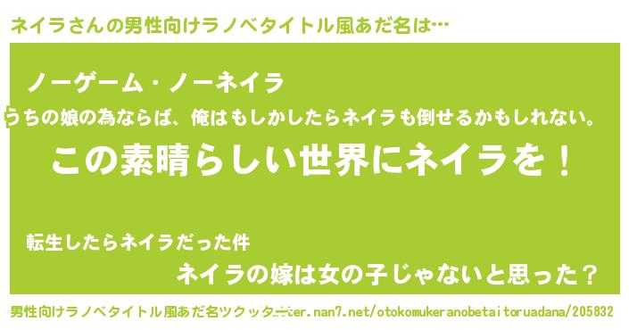 | 女子向けラノベタイトル風あだ名 | 『悪役ネイラに転生したようですが、知った事ではありません』 |
