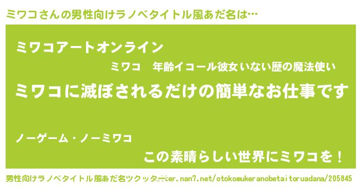 | 女子向けラノベタイトル風あだ名 | 『横柄ミワコと宰相陛下』『ミワコ恋絵巻』 |