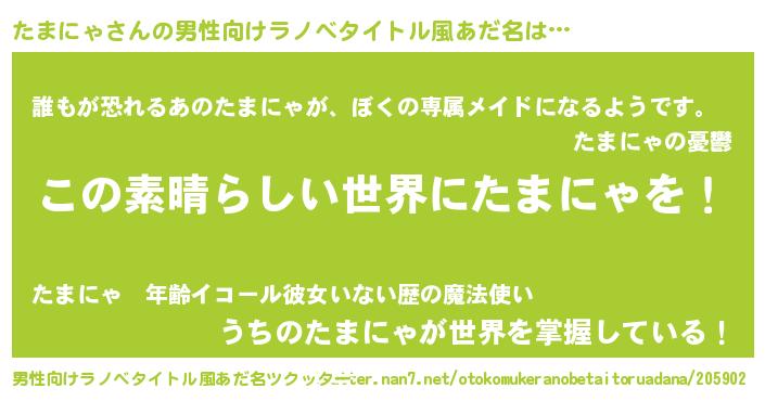 | 女子向けラノベタイトル風あだ名 | 『乙女ゲームの破滅フラグしかない悪役たまにゃに転生してしまった…』 |