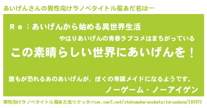 | 意味不明あだ名 | 『住所不定無職あいげん(50歳)』 |