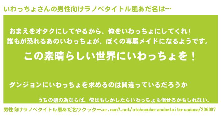 | 女子向けラノベタイトル風あだ名 | 『悪役いわっちょに転生したようですが、知った事ではありません』 |