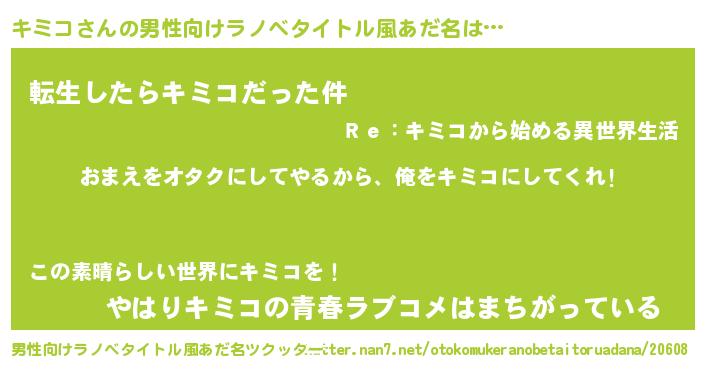 | 女子向けラノベタイトル風あだ名 | 『キミコ恋絵巻』『キミコの玉の輿計画!』 |