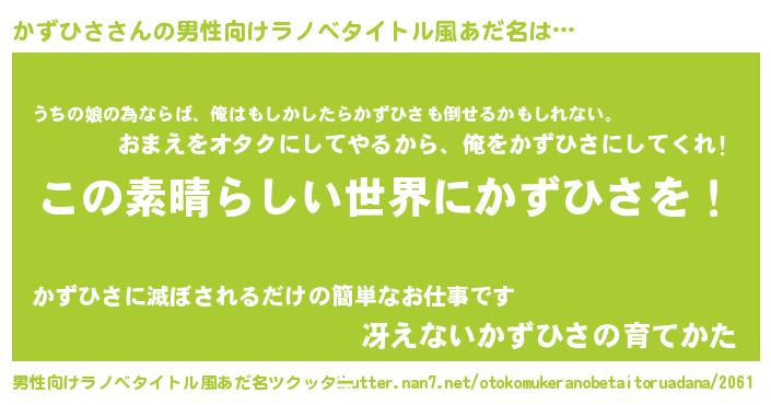 | 女子向けラノベタイトル風あだ名 | 『乙女ゲームの破滅フラグしかない悪役かずひさに転生してしまった…』 |