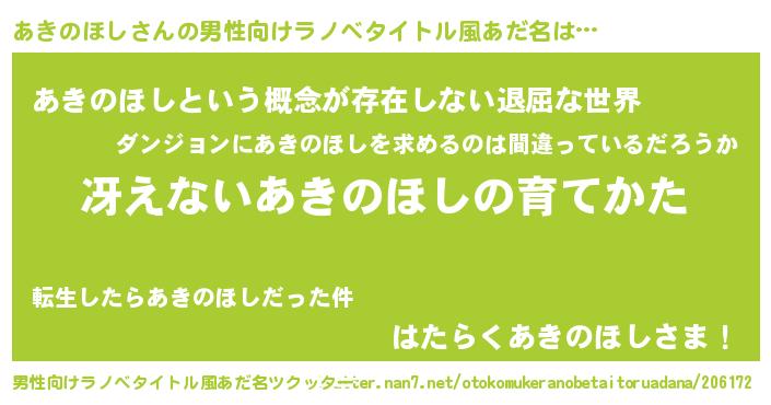 | 胡散臭い通販商品みたいなあだ名 | 『来世でも幸せになれる健康食品…その名も「あきのほし」』 |