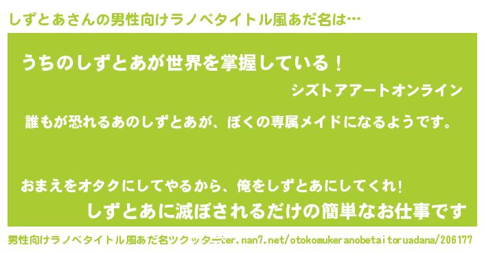 | 胡散臭い通販商品みたいなあだ名 | 『来世でも幸せになれる水素水…その名も「しずとあ」』 |