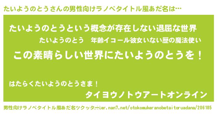 | 意味不明あだ名 | 『住所不定無職たいようのとう(98歳)』 |