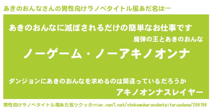 | 女子向けラノベタイトル風あだ名 | 『死神あきのおんなの再婚』 |