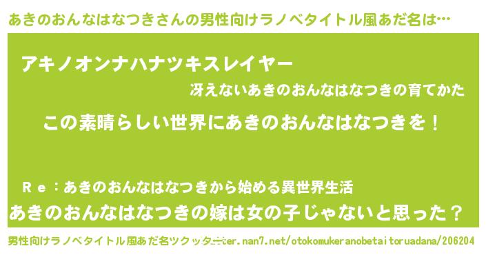 | 女子向けラノベタイトル風あだ名 | 『悪役あきのおんなはなつきに転生したようですが、知った事ではありません』 |