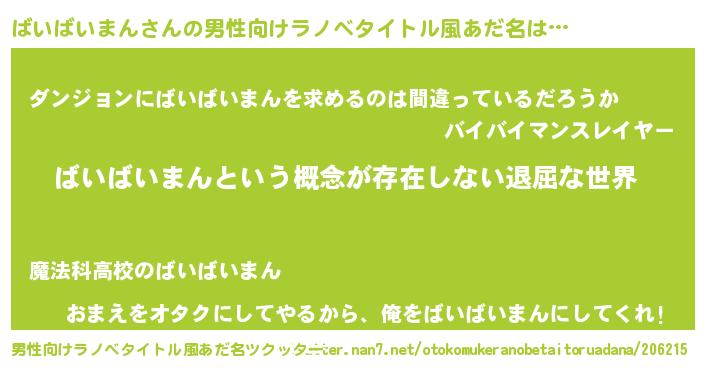 | 女子向けラノベタイトル風あだ名 | 『異世界で失敗しない100のばいばいまん』 |