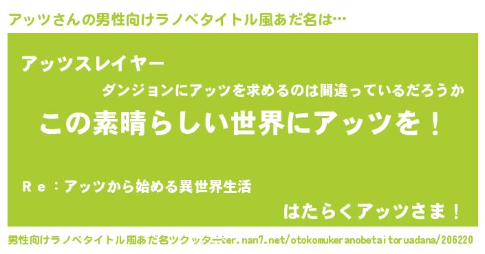 | 女子向けラノベタイトル風あだ名 | 『乙女ゲームの破滅フラグしかない悪役アッツに転生してしまった…』 |