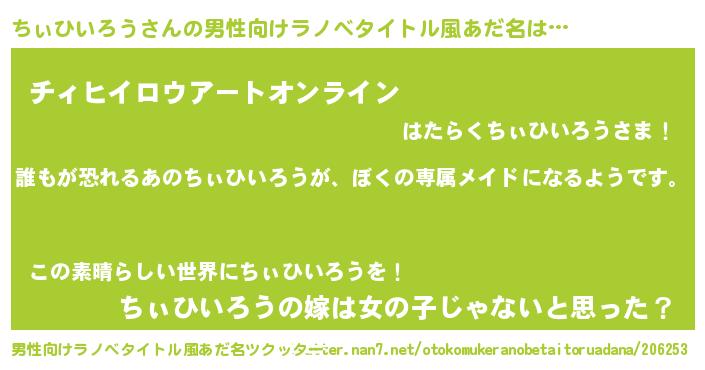 | 女子向けラノベタイトル風あだ名 | 『異世界でカフェちぃひいろうを開店しました。』 |