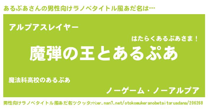 | 女子向けラノベタイトル風あだ名 | 『あるぷあが死なない童話 林檎のあるぷあの診療簿』 |