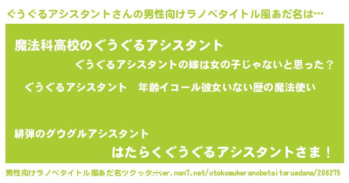 女子向けラノベタイトル風あだ名 | 『ぐうぐるアシスタントの玉の輿計画!』 |