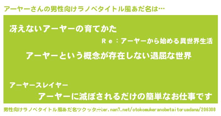 | 女子向けラノベタイトル風あだ名 | 『異世界で失敗しない100のアーヤー』 |