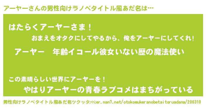 | 女子向けラノベタイトル風あだ名 | 『アーヤーの玉の輿計画!』 |