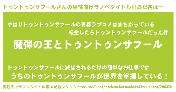 | 女子向けラノベタイトル風あだ名 | 『乙女ゲームの破滅フラグしかない悪役トゥントゥンサフールに転生してしまった…』 |