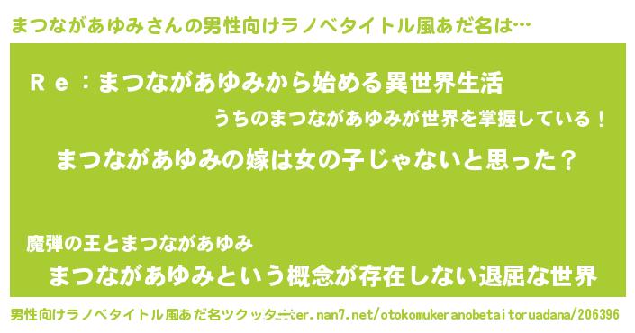 女子向けラノベタイトル風あだ名 | 『まつながあゆみの卵を拾いまして』 |