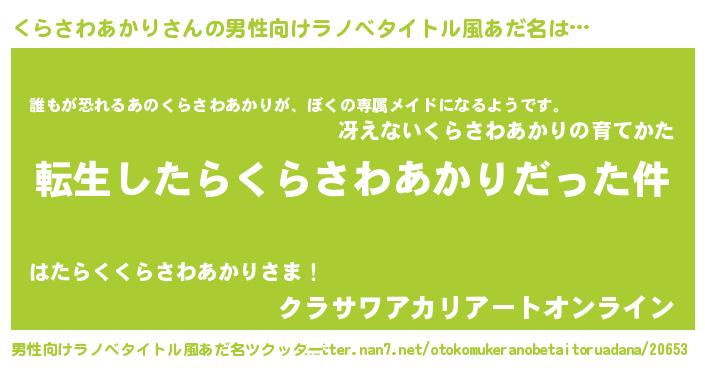 | 女子向けラノベタイトル風あだ名 | 『くらさわあかりの玉の輿計画!』 |