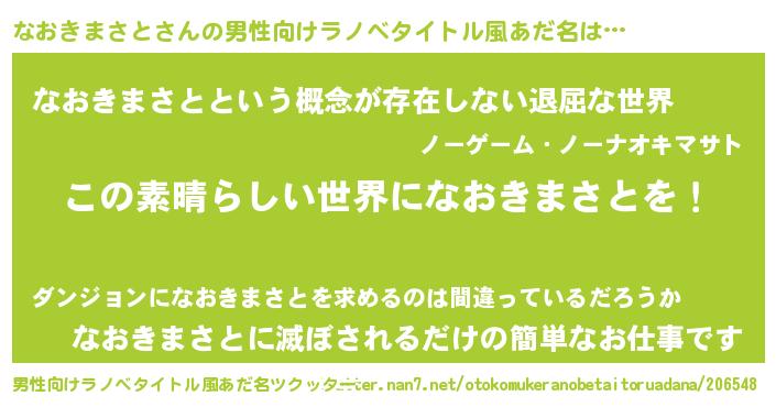 | 女子向けラノベタイトル風あだ名 | 『乙女ゲームの破滅フラグしかない悪役なおきまさとに転生してしまった…』 |