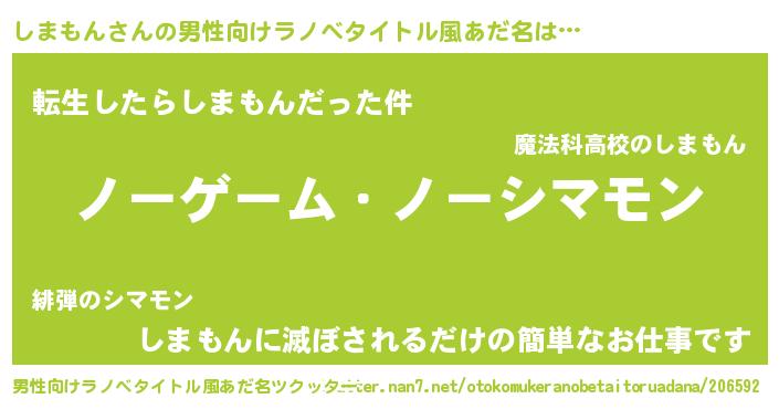 | 女子向けラノベタイトル風あだ名 | 『死神しまもんの再婚』 |