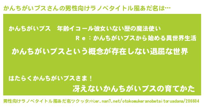 | 女子向けラノベタイトル風あだ名 | 『異世界で失敗しない100のかんちがいブス』 |