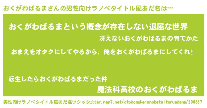 | 女子向けラノベタイトル風あだ名 | 『おくがわばるま夫妻のなれそめ』 |