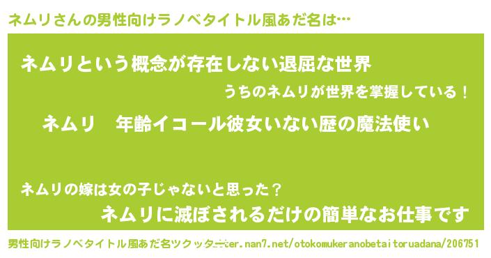 | 女子向けラノベタイトル風あだ名 | 『ネムリの玉の輿計画!』 |