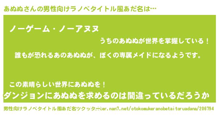 | 女子向けラノベタイトル風あだ名 | 『異世界でカフェあぬぬを開店しました。』 |