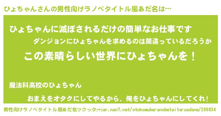 | 女子向けラノベタイトル風あだ名 | 『乙女ゲームの破滅フラグしかない悪役ひょちゃんに転生してしまった…』 |