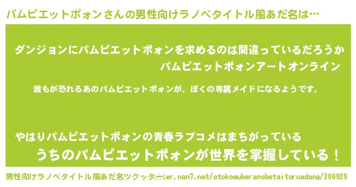 | 胡散臭い通販商品みたいなあだ名 | 『来世でも幸せになれる水素水…その名も「パムピエットポォン」』 |