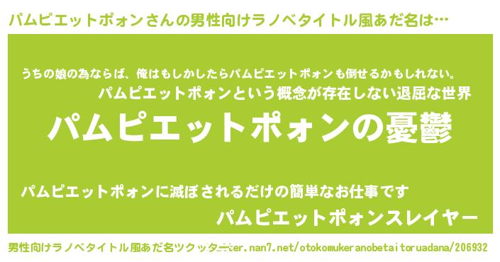 | 女子向けラノベタイトル風あだ名 | 『(仮)パムピエットポォンのやんごとなき事情』 |